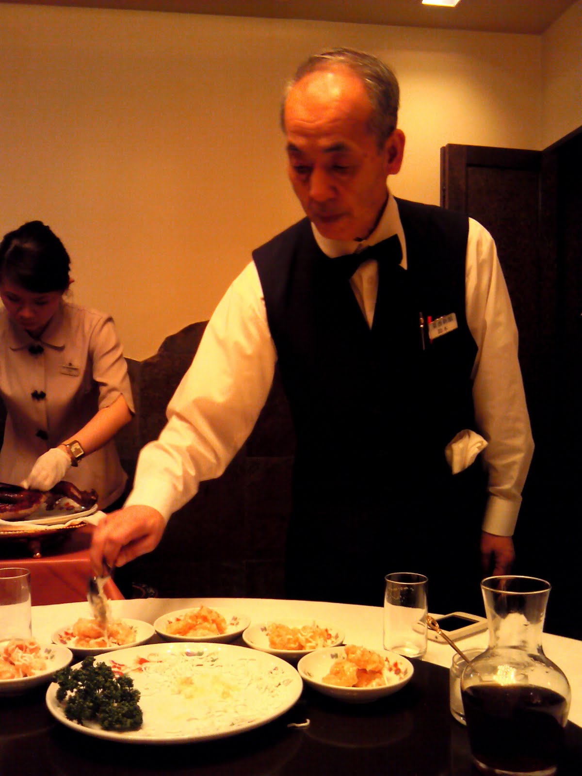 後ろのゴム手袋の女性がさっきの北京ダックの皮を一生懸命剥いでいます。